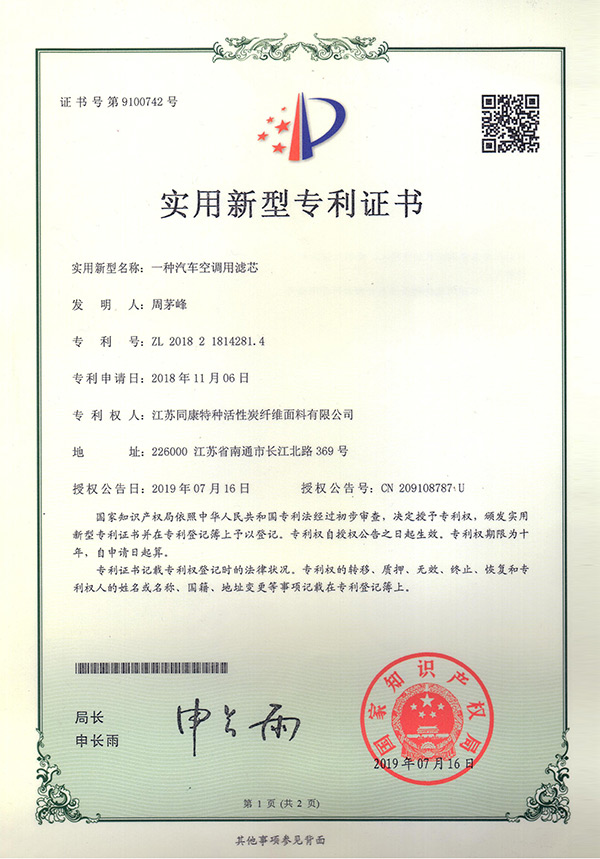 專利證書一種汽車空調(diào)用濾芯